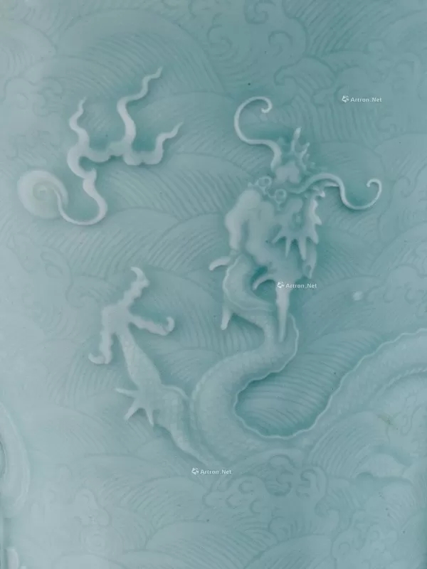 此梅瓶小口豐唇,寬肩斂腹,浮雕五龍,遨翔波濤海浪間,身披鱗片,爪趾或三或五,天威盡顯。一龍攀瓶而上,另見游龍兩兩相對,其中一側(cè)以蒼龍教子為題,肩上三爪巨龍,口含火珠,威風凜凜,俯視五爪幼龍奪浪而出,寄寓孝賢之道。罩施青釉柔潤晶瑩,翠中泛藍,釉料隨雕刻起伏散聚,層次分明,靈動如生。底書青花六字篆款。
